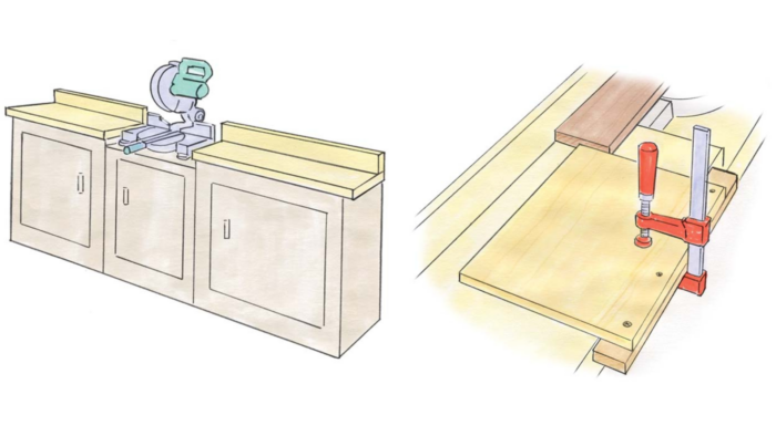 My first piece of advice is to incorporate your miter saw into a cabinet system that provides level support tables on both sides, coplanar with the base of the saw. My setup also includes rear fences that align with the saw. Once you have a setup like that, your work stops can be as simple as the T-square panels shown here. They slide anywhere along the support tables, keeping their edges square to the sawblade for accuracy. —ERIC RIMEL, Spring Green, Wis.