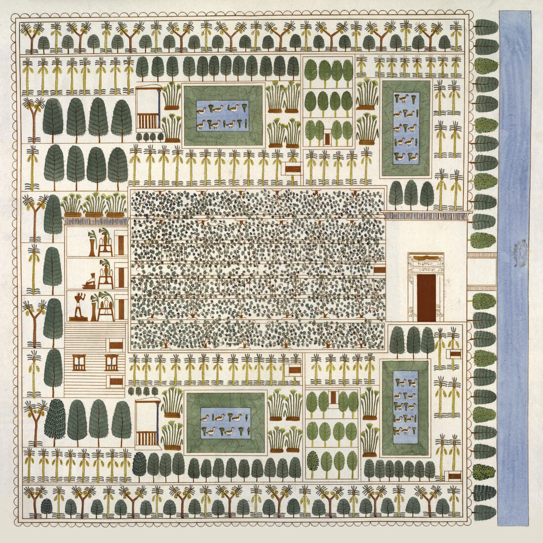 “Many depictions in tombs show what might be the standard garden: typically a symmetrical layout with a rectangular or T-shaped pond placed on the main longitudinal axis. Rows of trees surrounded the water, often arranged by height, with shorter species closest to the pond and taller palms planted at the perimeter. Pergolas lined primary paths, fruit trees were trained along trellises, and ponds were stocked with fish.”