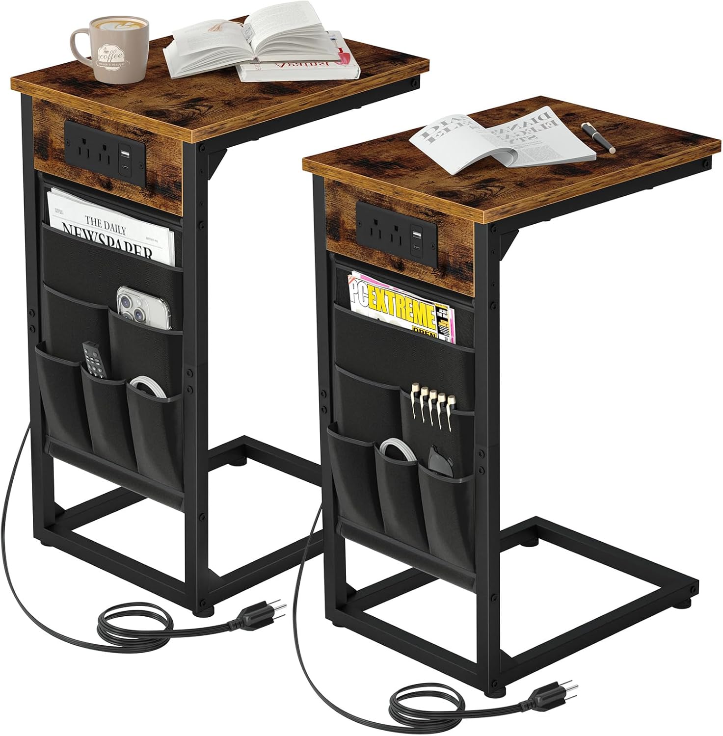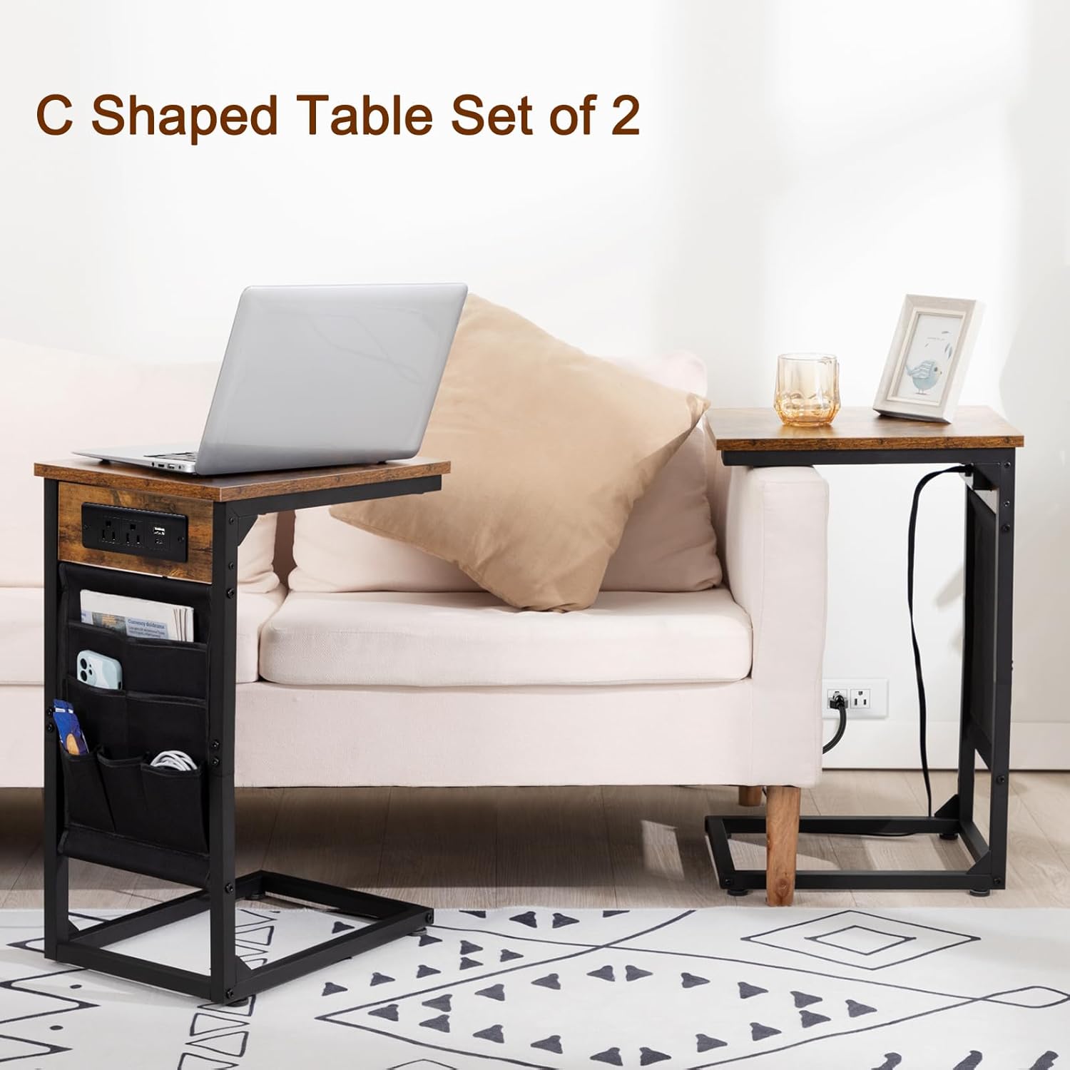 C Tables with USB Ports & Outlets: The two sofa side tables slide under the couch or bed easily. Our side tables set of 2 has 2 outlets, 1 USB port and 1 Type-c port which can totally charge your lamps, phones, tablet at the same time. The 4.9 ft long cord makes the couch side table a mobile charging station