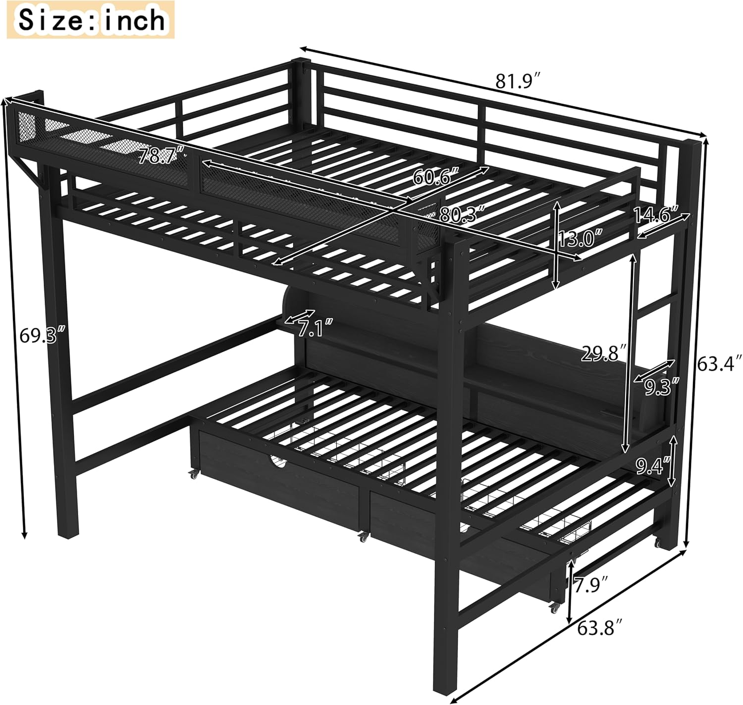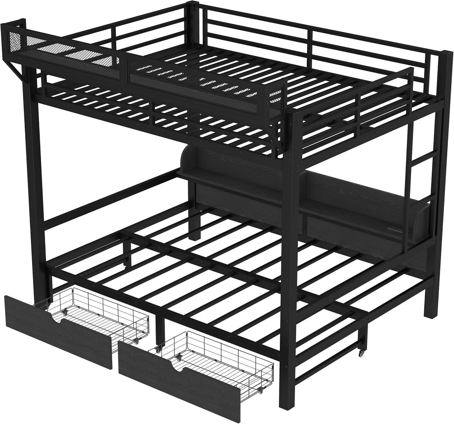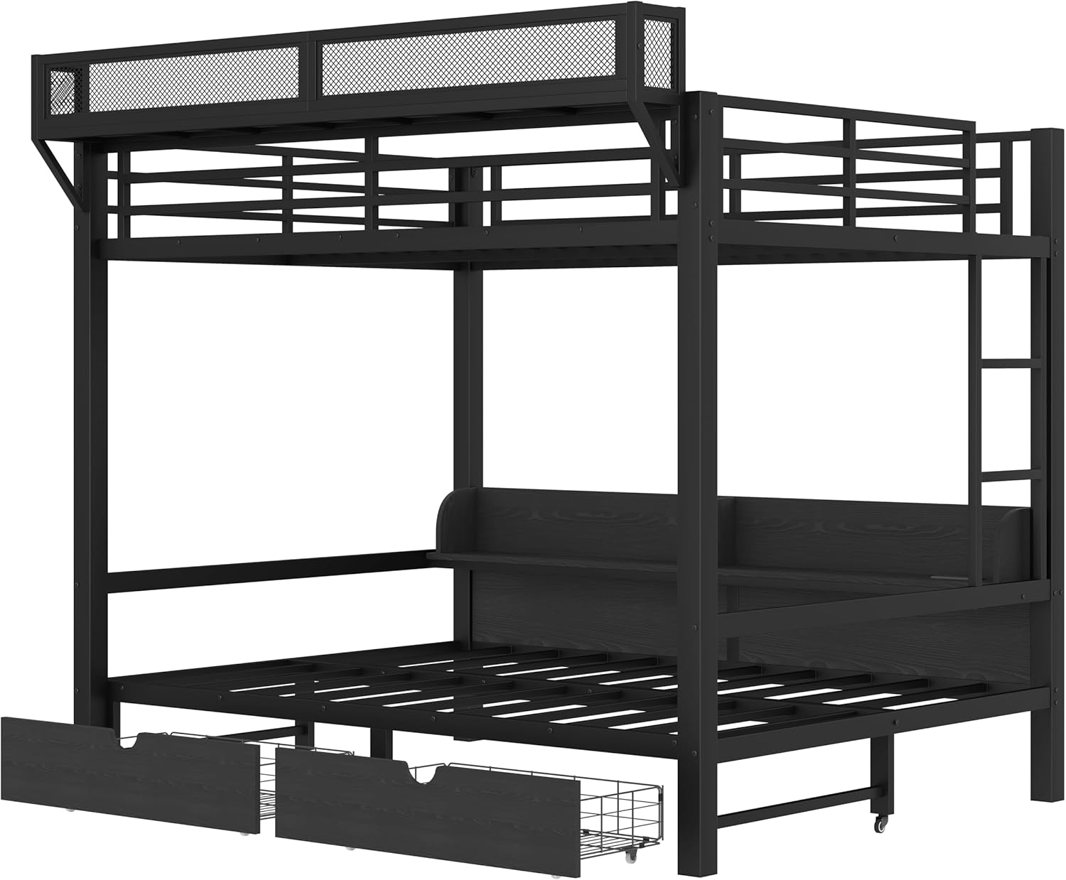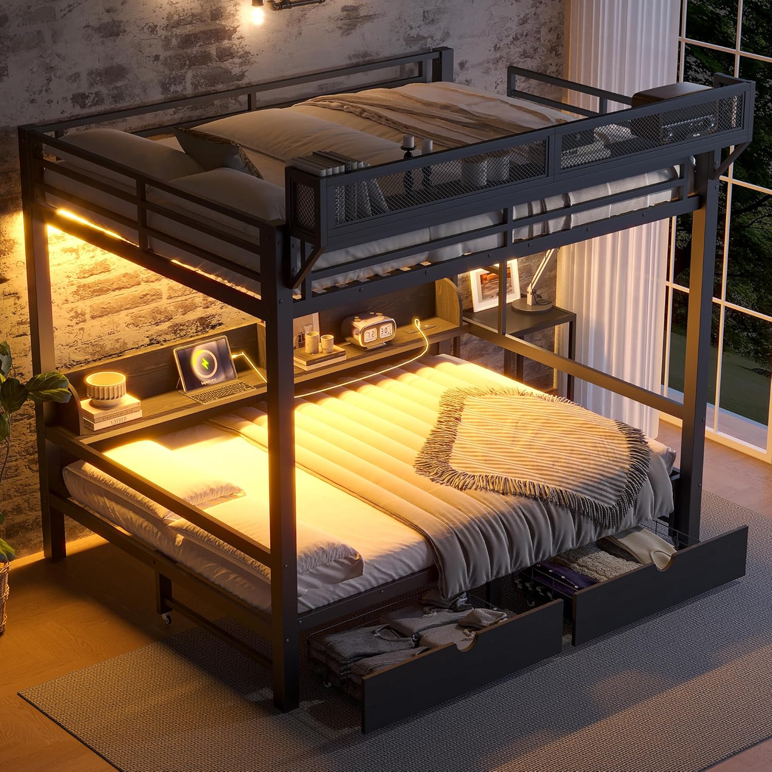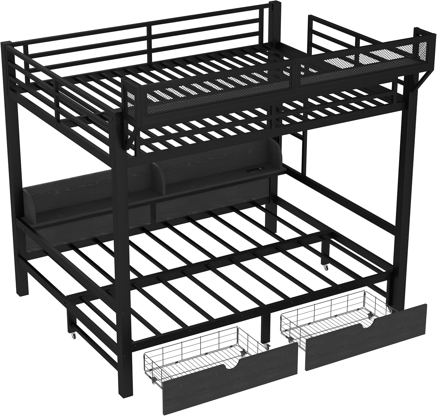 Bellemave Queen Over Queen Bunk Bed Frame with Storage Shelves & Drawers, Metal Bunk Bed Queen Over Queen with Charging Station & LED Lights, Space Saving Beds Frame Convertible to Sofa Design, Black