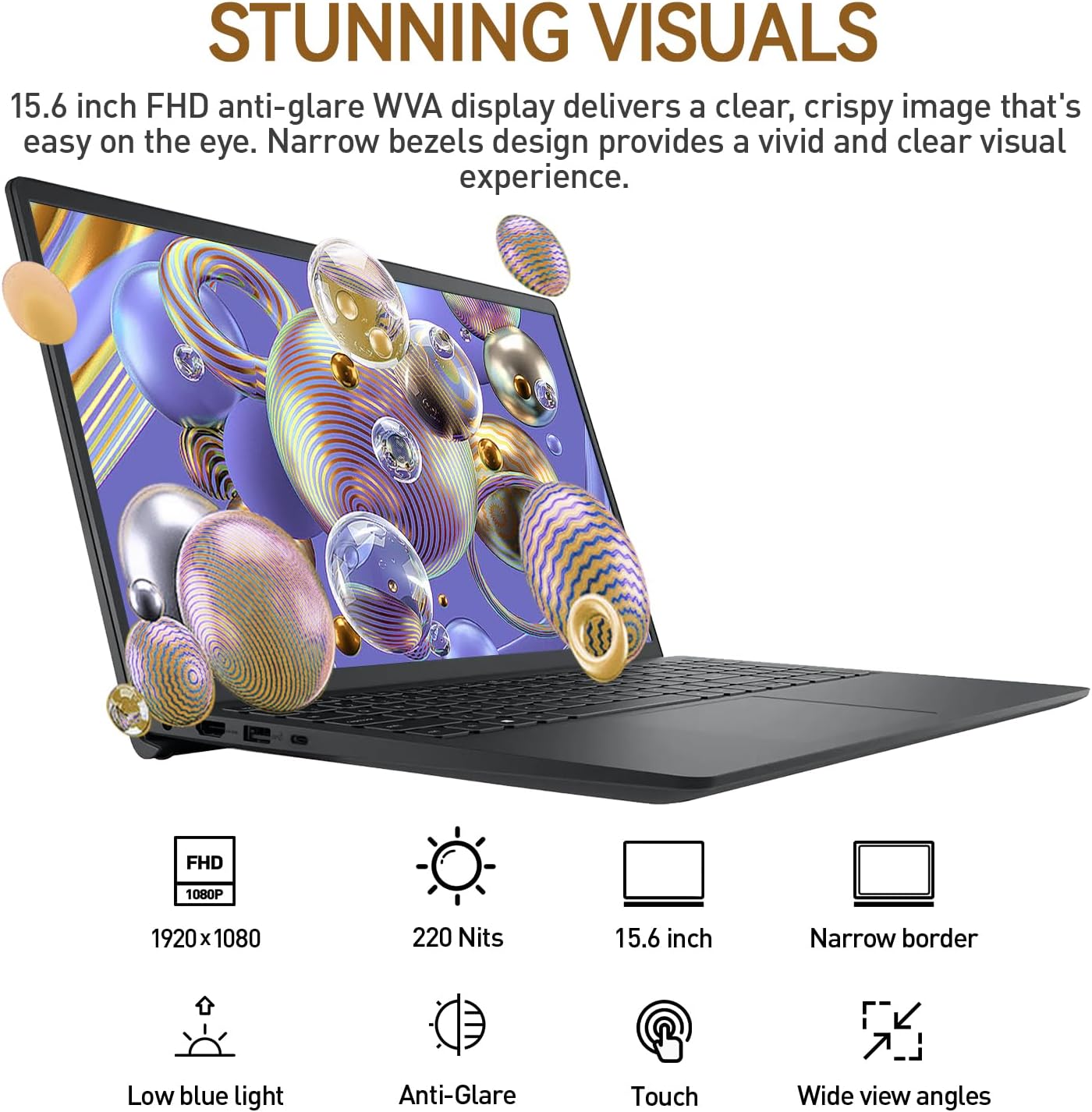 IMMERSIVE DISPLAY: The Dell Inspiron laptop features a 15.6 inch FHD (1920 x 1080) IPS Touch Screen with sharp details and vibrant colors. Featuring an anti-glare, LED-backlit WVA display, the Dell laptop 15 inch screen offers an immersive multimedia and comfortable visual experience. TÜV Rheinland certified solution reduces blue light emissions. With its slim and durable design in a classic black finish, the thin and lightweight Dell touchscreen laptop 15.6 inch looks as good as it performs