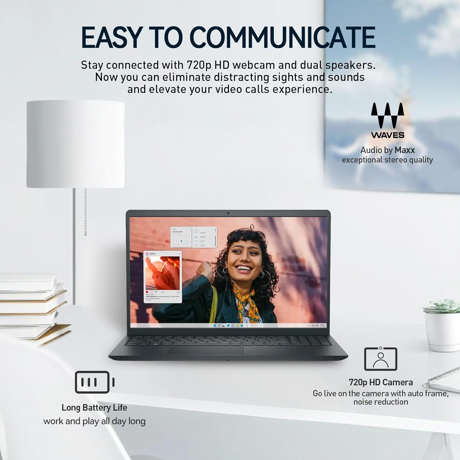 720p Webcam + dual digital microphone array – look and sound your best