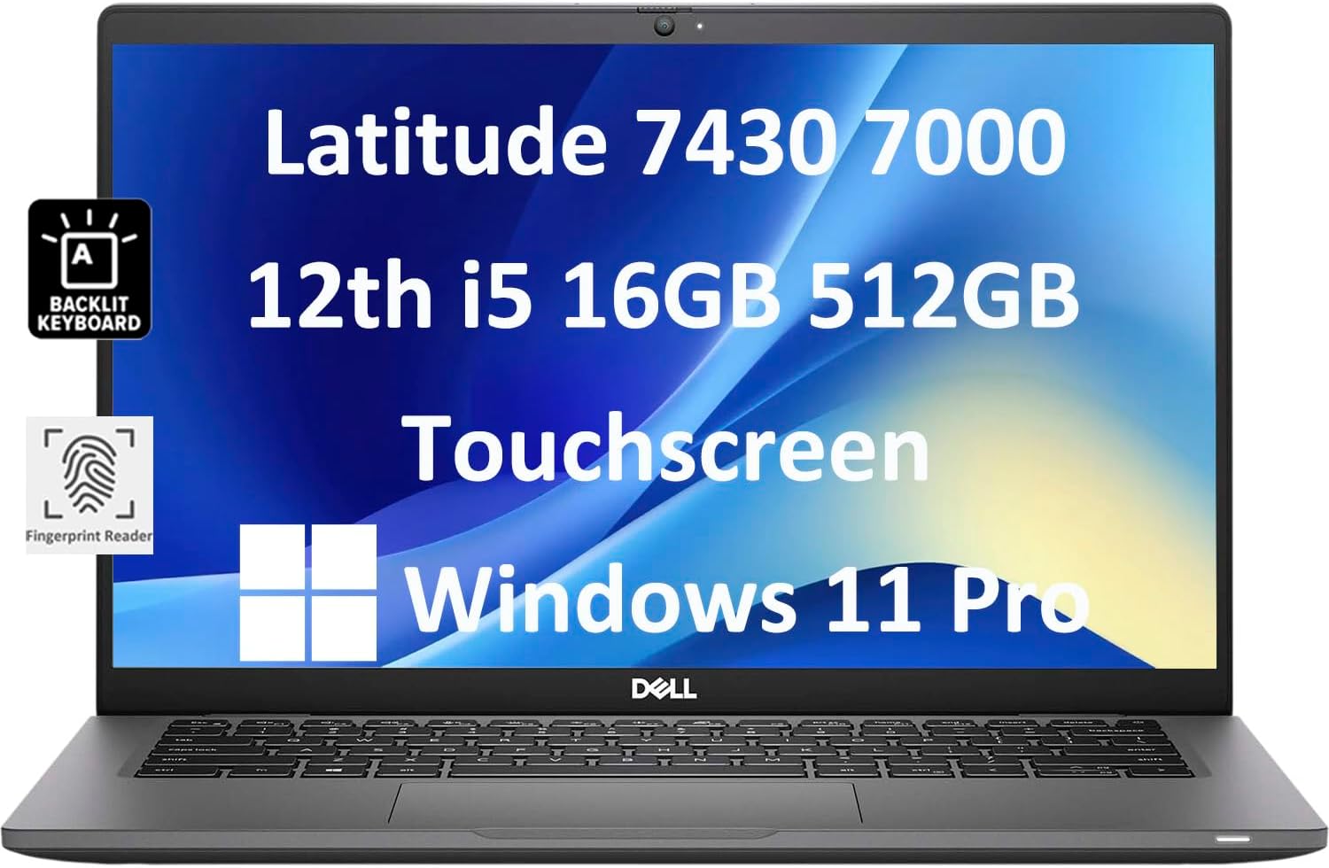The Dell Latitude 7430 is a 14” FHD touchscreen business laptop featuring a 10-core i5-1245U CPU, 16GB RAM, 512GB SSD storage, backlit keyboard, fingerprint reader, Wi-Fi 6E connectivity, FHD IR webcam, and Windows 11 Pro.