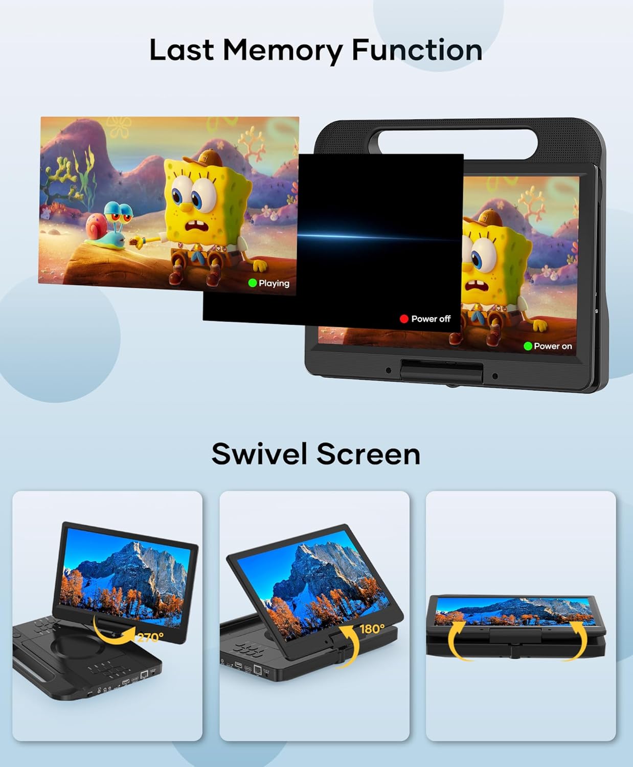 【Last Memory Function and Swivel Screen】The portable blu ray player with screen supports last memory function, it picks up each exciting scene from where you left last time, no need to worry about starting from the beginning each time. With 270 degrees rotation and 180 degrees flip screen, you can adjust the screen at the most comfortable view angle, relieve eye strain