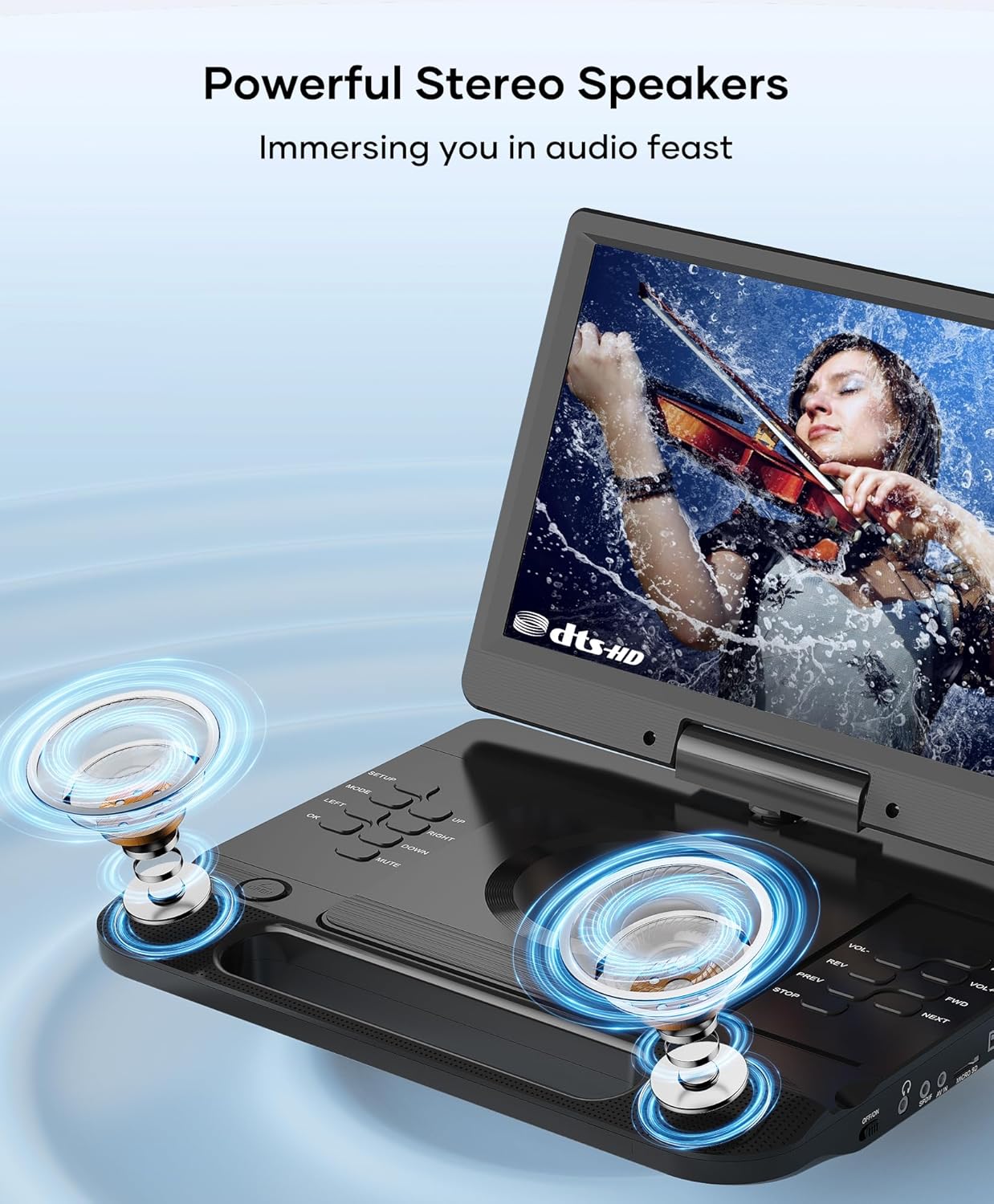 【Powerful Stereo Sound】The portable blu ray dvd player with dual powerful speakers, making sound louder and clearer, bringing you immersive audio experience, you can also plug in headphones or speaker to get better hearing experience via the 3.5mm jack