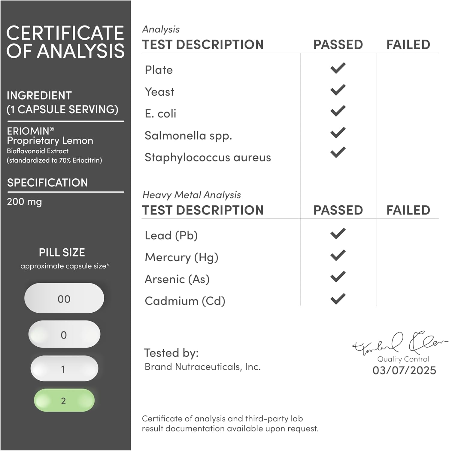 CLINICALLY STUDIED INGREDIENT: Eriomin is a proprietary bioflavonoid extract that is standardized to 70% Eriocitrin, 5% Hesperidin, and 4% Naringin. It has been clinically studied to help support GLP-1 levels and may support positive gut flora.