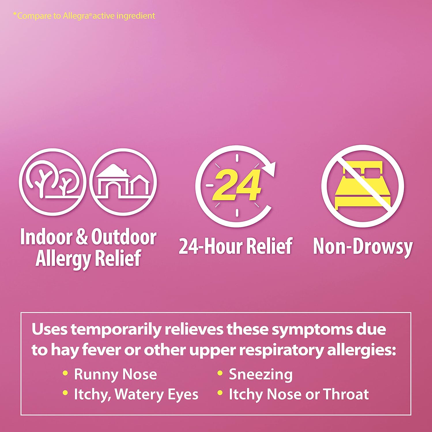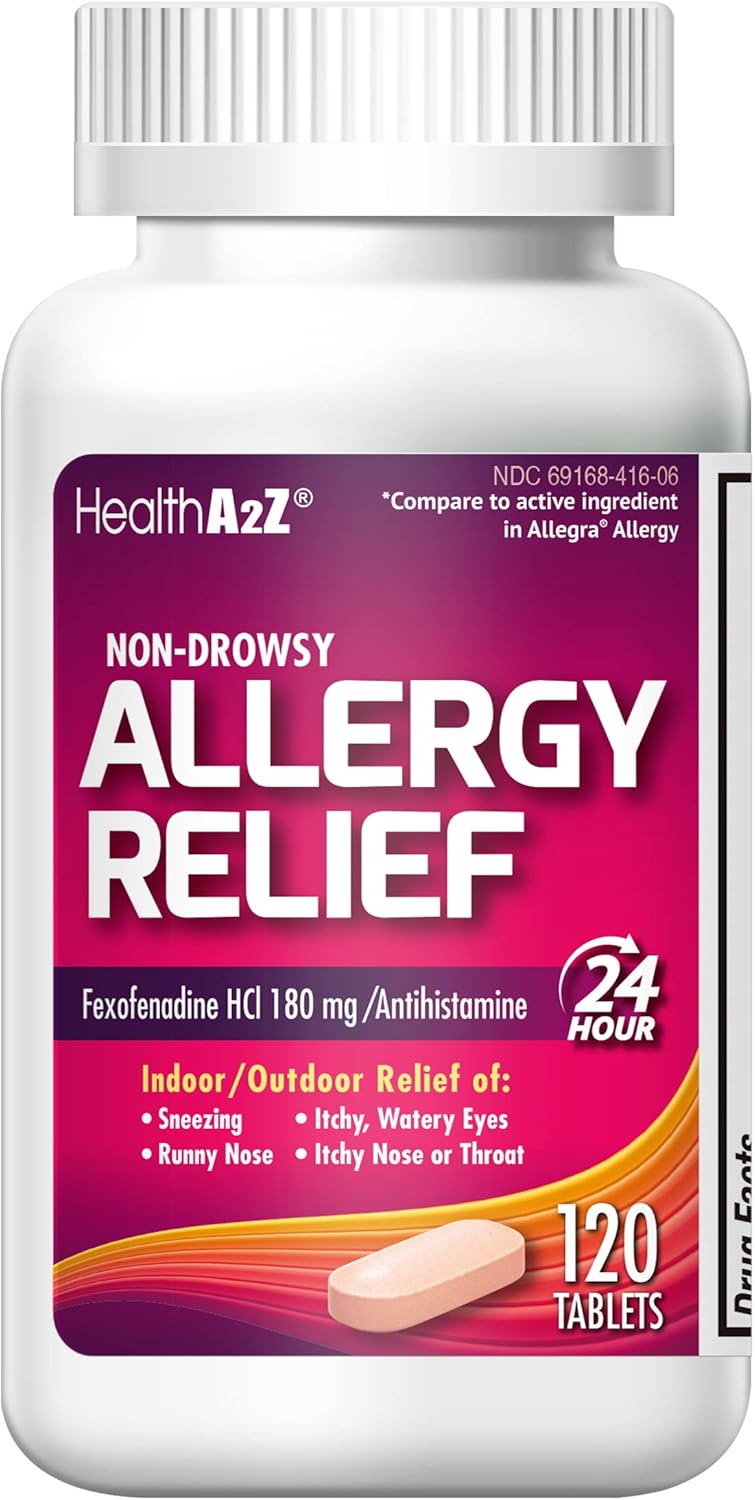HealthA2Z Allergy Relief, Fexofenadine HCl 180mg provides 24 hour indoor and outdoor allergy relief. Fexofenadine HCl antihistamine blocks the bodies allergic responses. Provides relief from hay fever or other upper respiratory allergies. Helps relieve runny nose, itchy, watery eyes, sneezing, and itchy nose and throat.