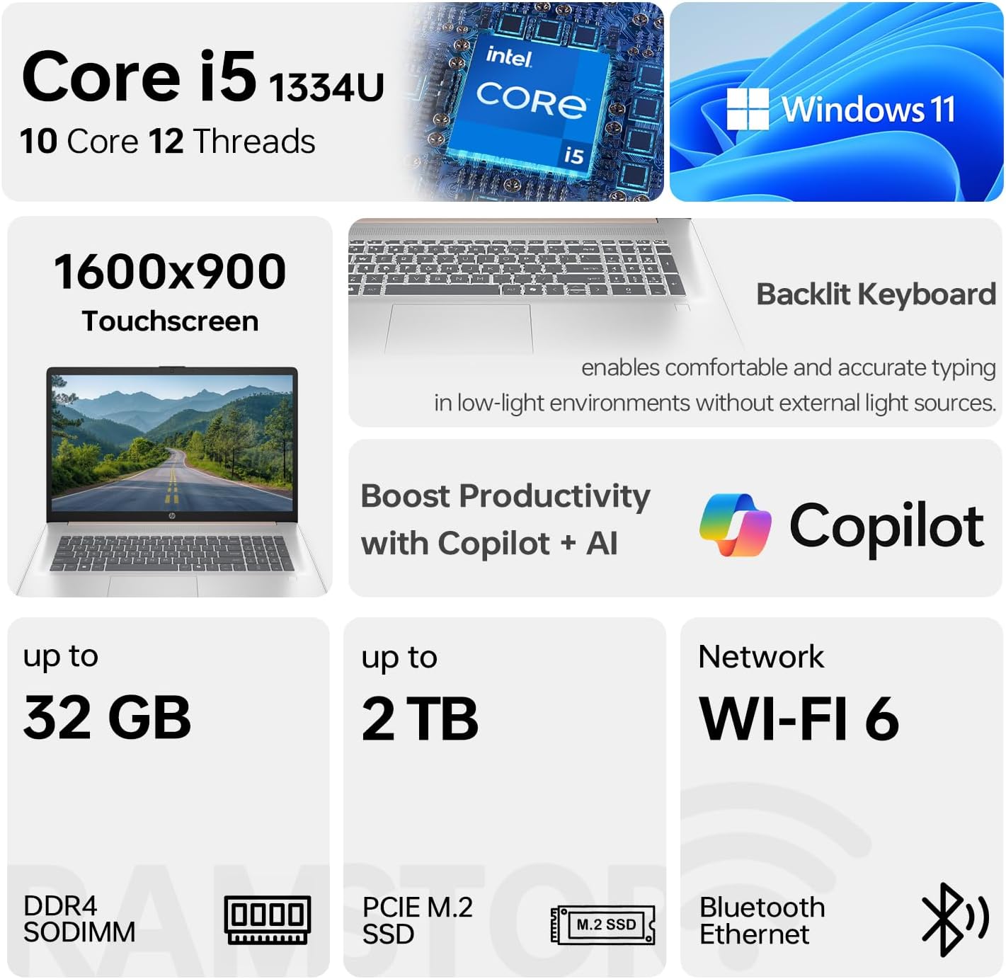 【Display】17.3″ diagonal, HD+ (1600 x 900) 60Hz, touch, BrightView, 250 nits
