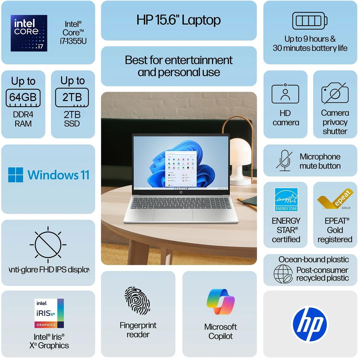 Display: 15.6-inch diagonal, FHD (1920 x 1080), micro-edge, anti-glare, 250 nits, 45% NTSC