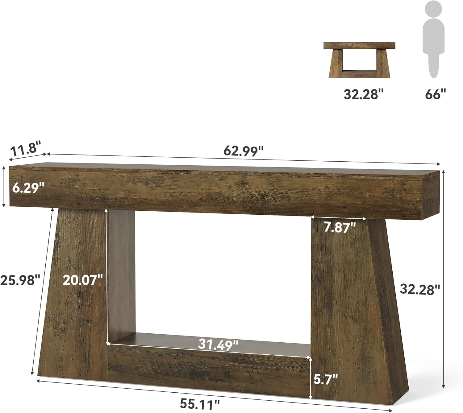 62.99″D x 11.81″W x 32.28″HIts size is well designed to fit behind the sofa or in the hallwayWhether you want to display your book collection, decorative items or use it as an island, it provides plenty of space