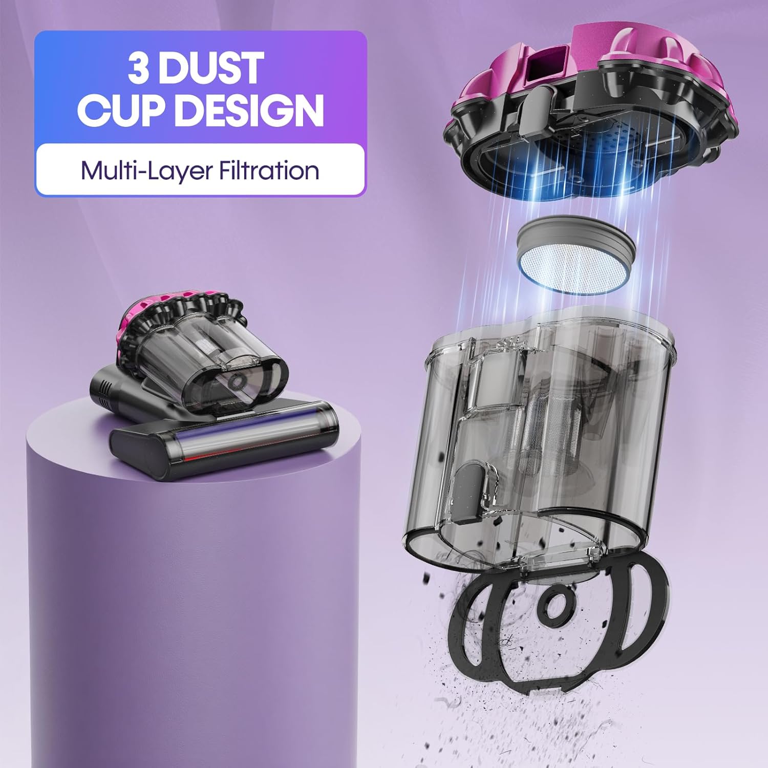【Triple Dust Cup with One-Touch Empty】 Upgraded mattress vacuum cleaner features 3 dust cups for efficient separation. One-touch emptying design makes disposing of dust quick, hygienic and convenient, avoiding secondary pollution