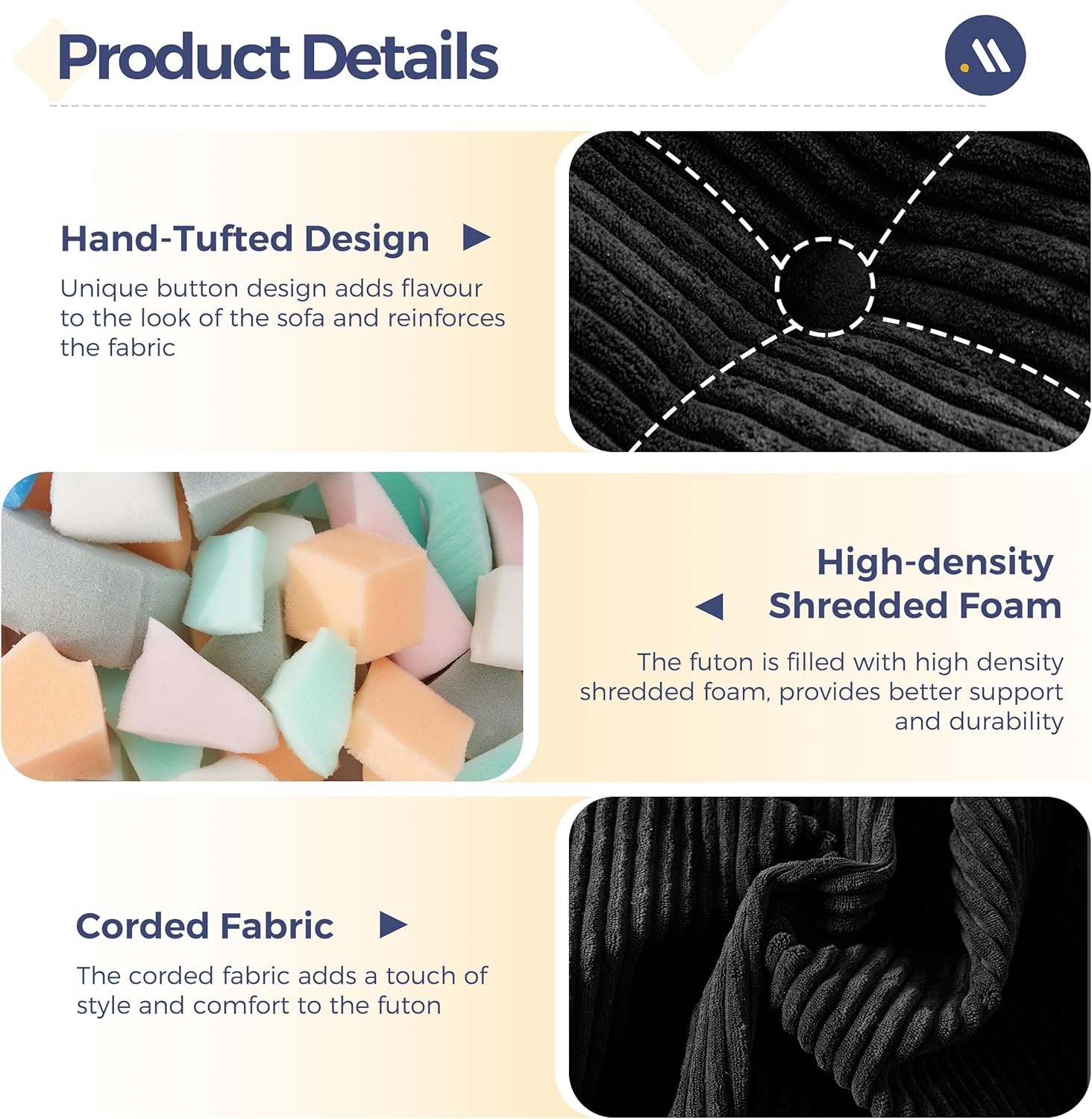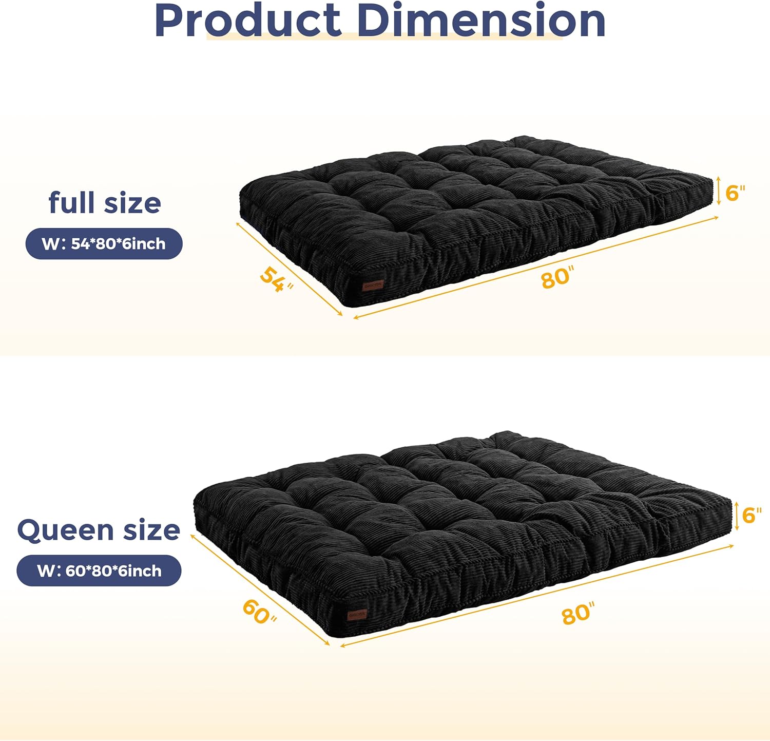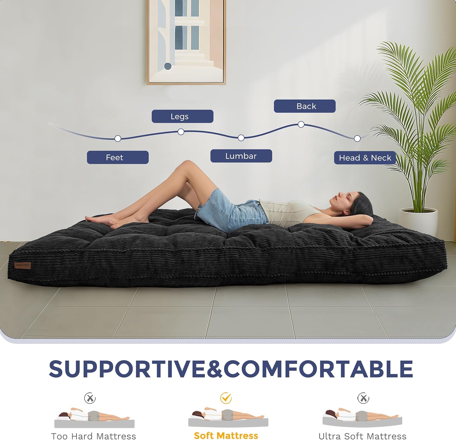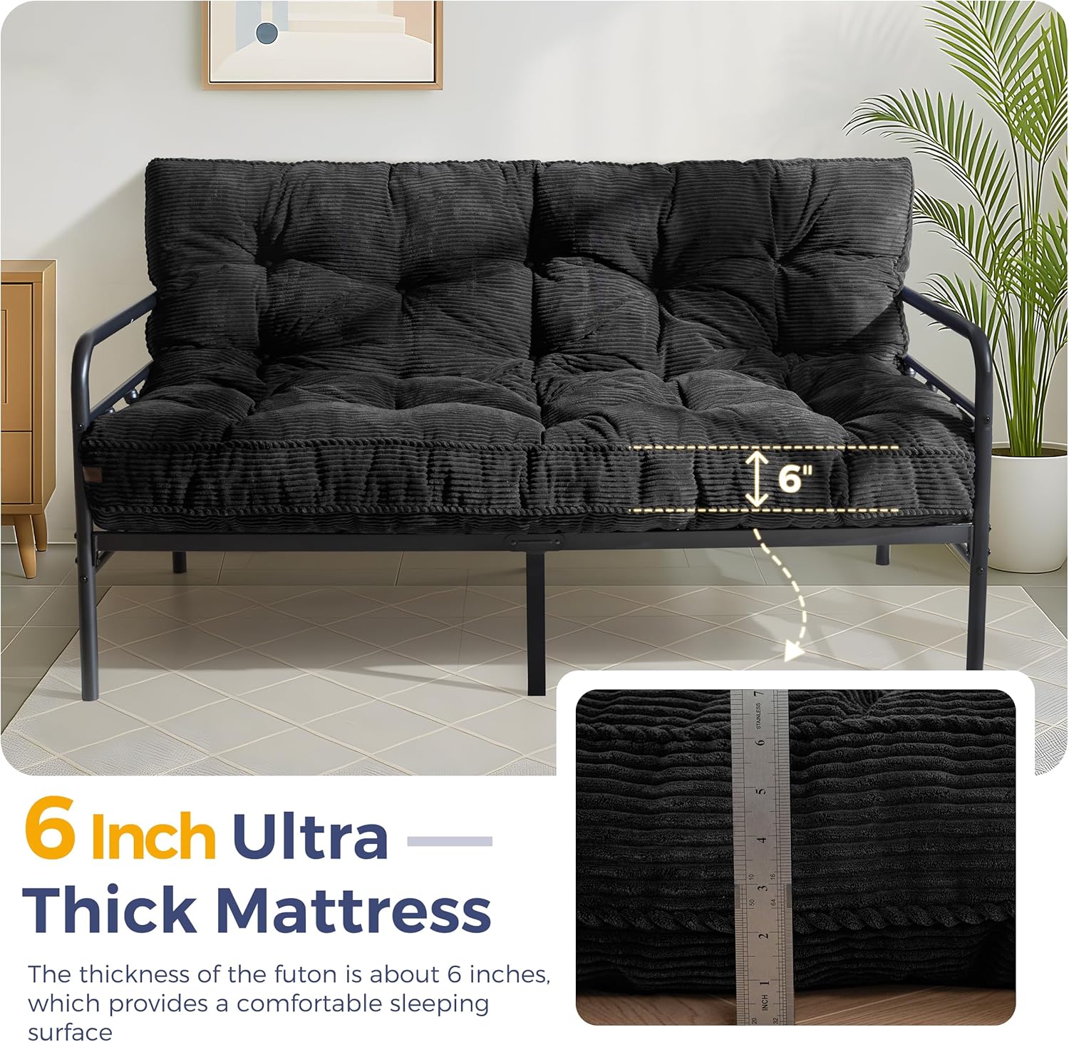 Versatile & Thick Futon: The thickness of the futon is about 6 inches, which provides a comfortable sleeping surface with ample cushioning and support. It is suitable for use on futon frames or as a mattress on its own on the floor. The futon is filled with high-density shredded foam. The corded fabric adds a touch of style and comfort to the futon, making it a stylish and inviting addition to your home furnishings