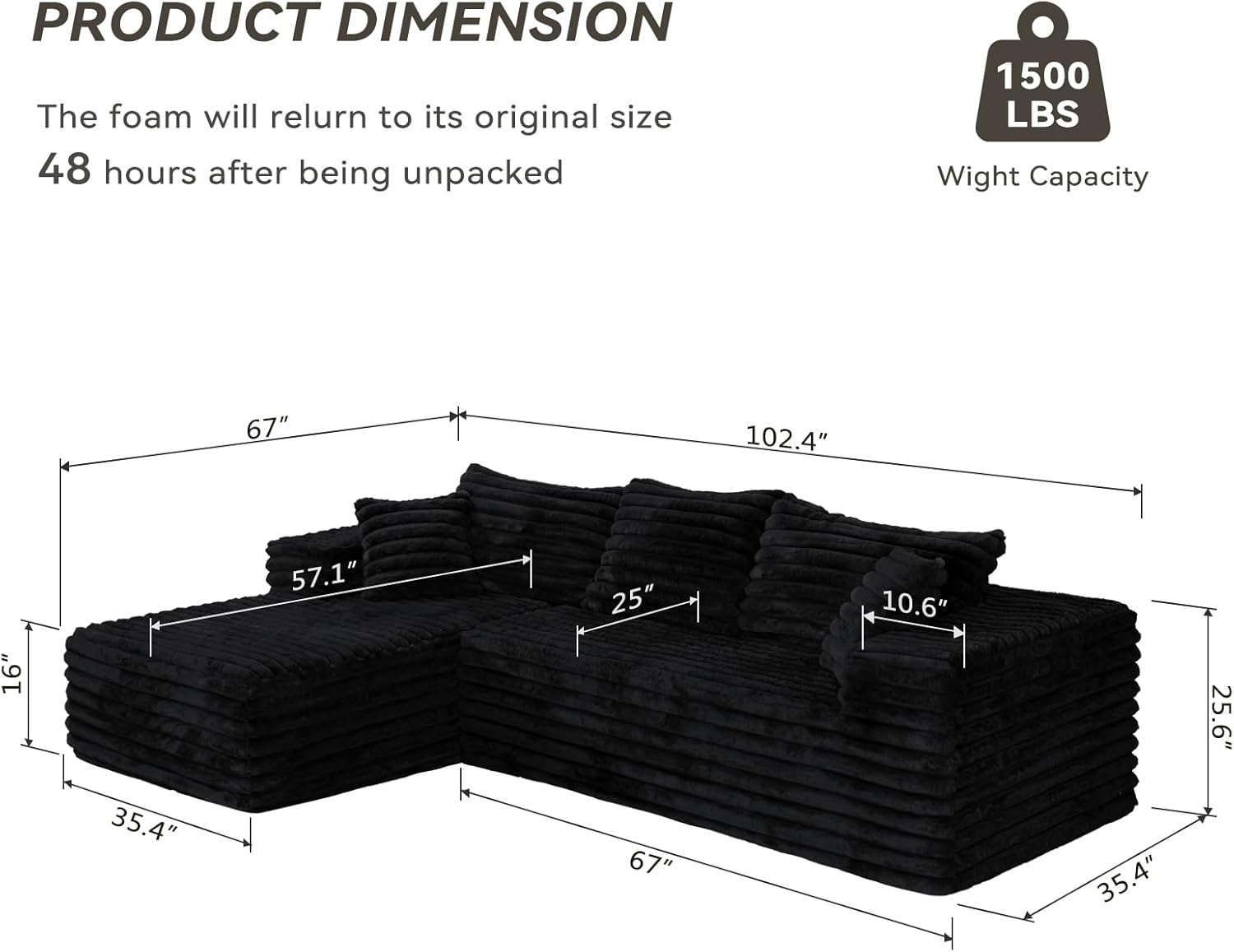 【No Assembly Required】Ships in compact boxes for easy transport. Simply unbox and watch it expand into a full-size sectional—zero tools, zero effort. Full fluffiness typically develops within 72 hours. Relax and unwind, the easy way!